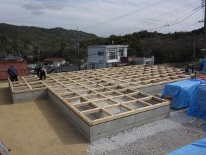 土台と大引きを入れました 2019-04-06 最終更新日時 : 2019-04-06 坂田 墨出しを行い、土台を敷き、大引きを入れました。 土台と大引きは910ミリの正方形になるように入れています。 この後に、床下断熱材を入れ、床剛性を確保するために24ミリ、 又は、28ミリの構造用合板を張ります。 写真のように正方形の碁盤の目のように土台と大引きを組み、構造用合板を張ると 床の合成がかなり良くなります。
